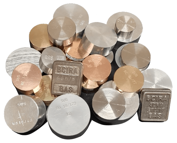 Standards for Ferrous and Non-Ferrous Metals, Ferroalloys, Ores and Minerals, available in block, disc, powder, filings, among others.